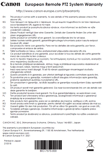 Kõikidele Euroopa Majanduspiirkonnas (EMP – kuhu kuuluvad EL, Island, Lichtenstein, Norra), Šveitsis ning Ühendkuningriigis (edaspidi „territoorium“) kasutamiseks mõeldud ja sealt ostetud Canoni kaugjuhitavatele PTZ-kaameratele kehtib Canoni kaugjuhitavate PTZ-kaamerate Euroopa garantii. Canon garanteerib, et kui uuel kaugjuhitaval PTZ-kaameral esineb defekt garantiiaja jooksul, lahendatakse probleem tasuta (rakenduvad tingimused – vaadake alt).